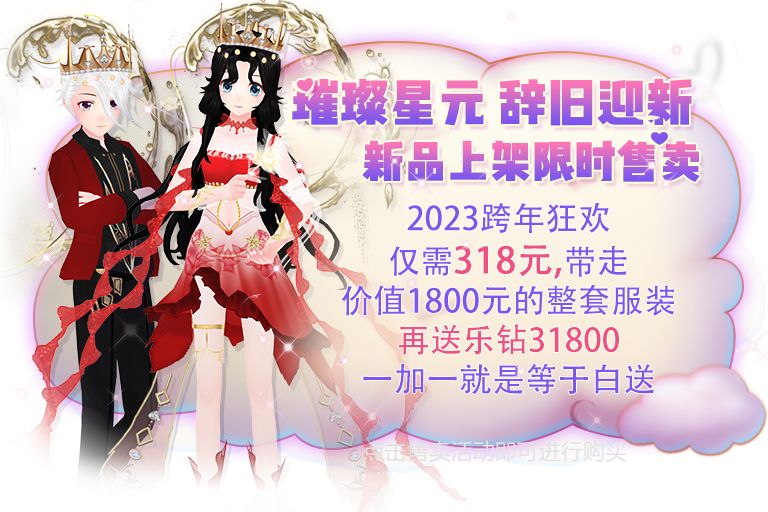 2023跨年狂欢!璀璨星元,辞旧迎新,新品上架限时售卖,仅需318元,带走价值1800元的整套服装!再送乐钻31800!一加一等于白送!