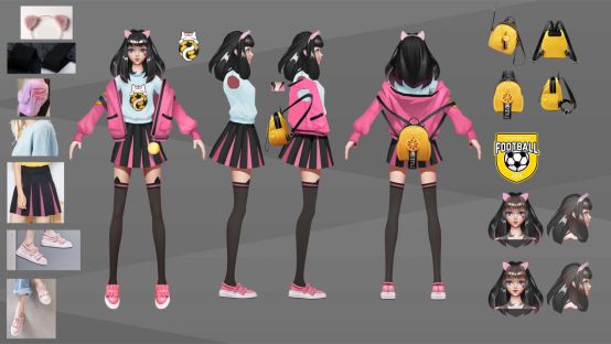 芙妹儿的形象设计中也透露着设计师对其的喜爱——外套拉链上的黄色毛球、手臂上的“FOOTBALL TOURNAMENGT”logo、背包上的橙子片挂饰以及眼角下的爱心涂彩,都彰显着芙妹儿对足球的热爱。