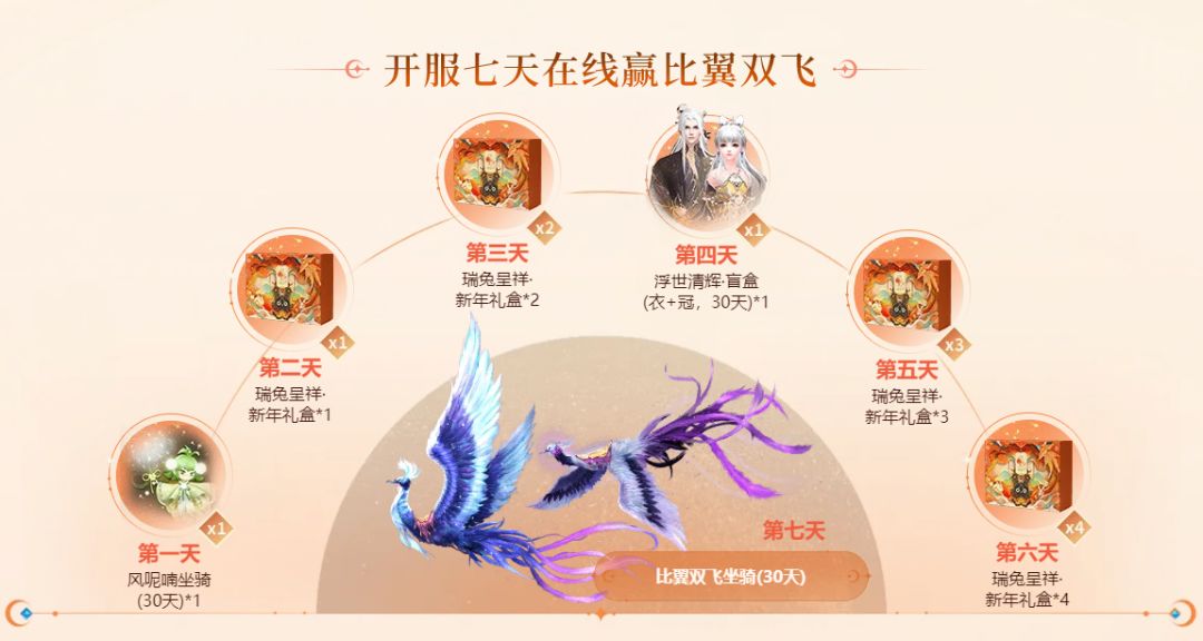 风呢喃坐骑、浮世清辉时装盲盒(衣+冠)、瑞兔呈祥新年礼盒,登录七天更将抽取比翼双飞坐骑,如此丰厚的奖励,菌菌看了都心动。