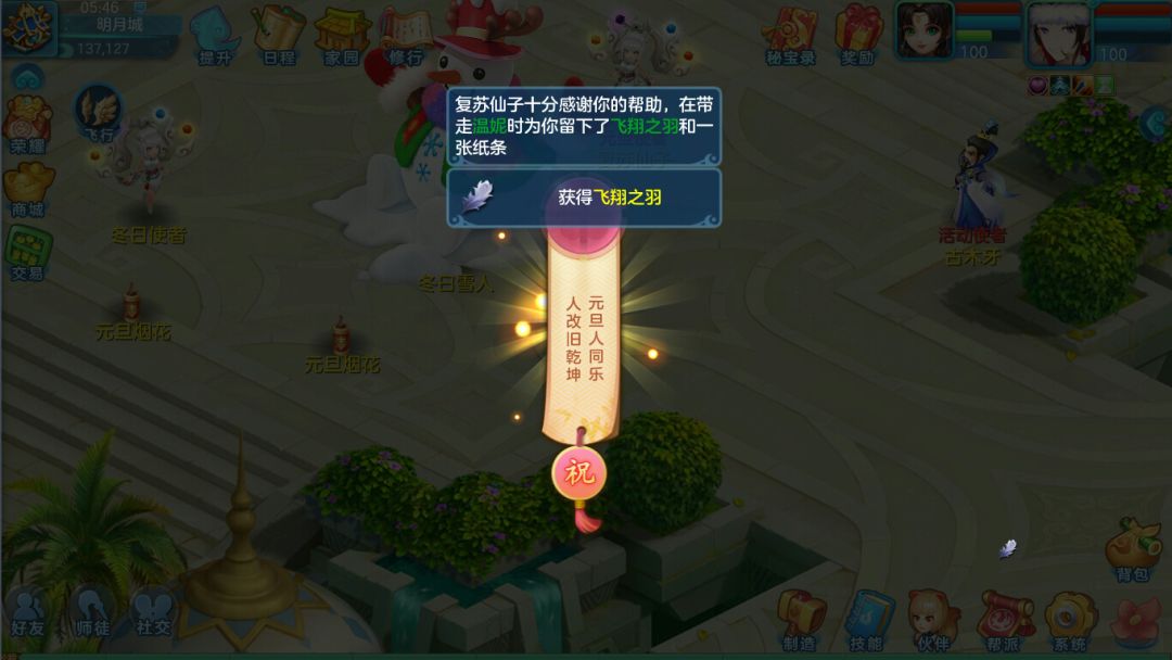 1)12月29日维护后-1月3日24:00,点击各场景的“元旦烟花”,释放烟花获取元旦礼盒奖励,概率获取限时神兽变形丹;