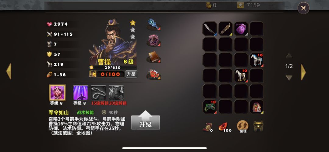 英雄选择曹操、夏侯惇,防御塔使用练兵、破敌、术塔精通、三昧真火。曹操、夏侯惇装备如图所示
