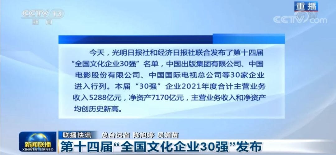 第十四届“全国文化企业30强”名单(排名不分先后)如下: