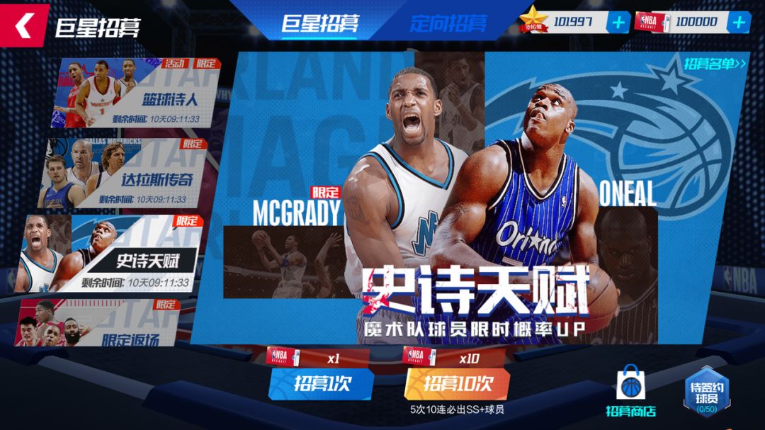 活动期间内,在“史诗天赋”球员池中,抽到限定魔术麦迪、沙奎尔·奥尼尔的概率up!