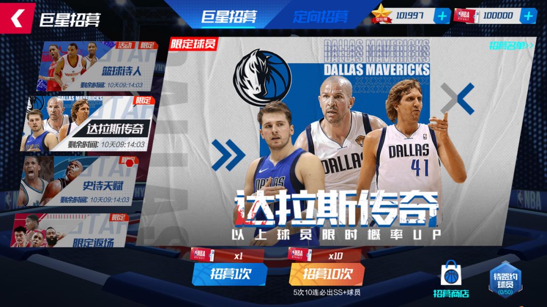 活动期间内,在“达拉斯传奇”球员池中,抽到限定独行侠贾森·基德、卢卡·东契奇、德克·诺维茨基的概率up!
