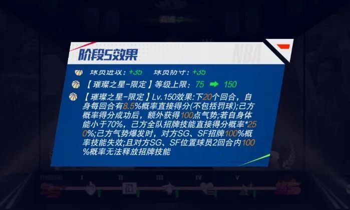 【招牌技能】璀璨之星-限定:下X个回合,自身每回合有X%概率直接得分(不包括罚球);己方概率得分成功后额外获得Y点气势;若自身体能小于X%,己方全队直接得分概率*Y%(上线同时开启迈向巅峰)