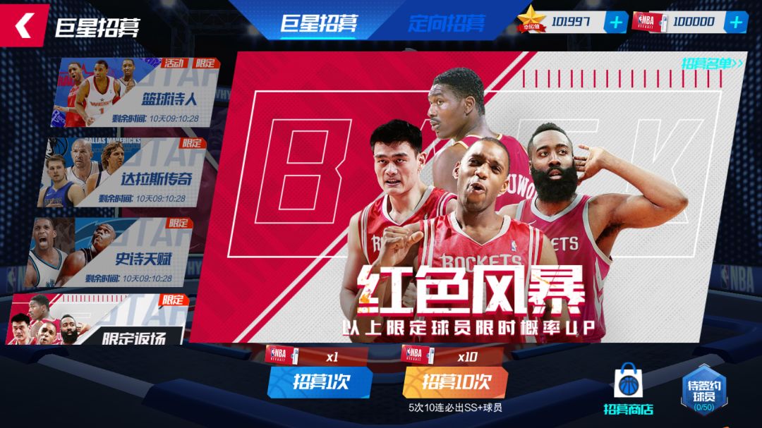 活动期间内,在“红色风暴”球员池中,抽到限定火箭姚明、麦迪、詹姆斯·哈登、奥拉朱旺的概率up!
