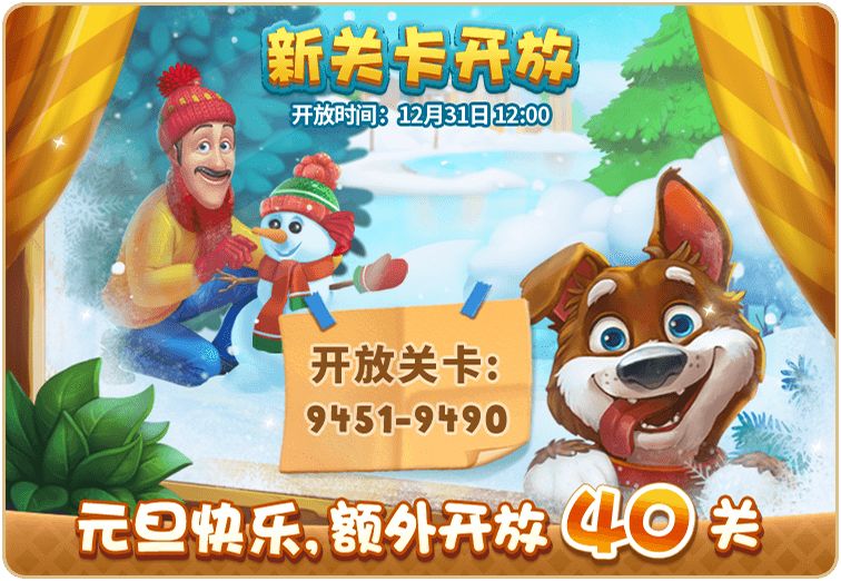 12月31日:关卡更新至9490、双倍星星、谜雾疑踪-冒险返场、世界奇旅、魔法帽、园艺师联盟、烟花节