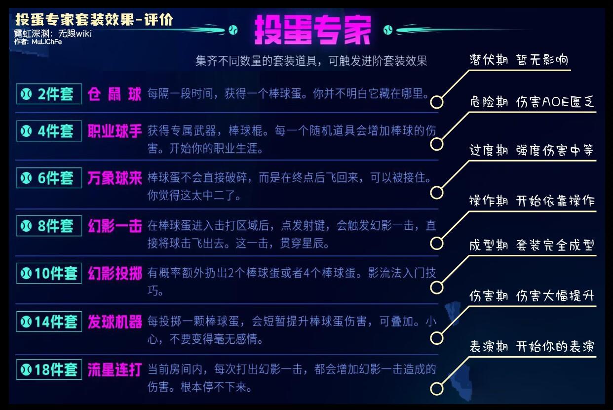 投蛋专家拥有不俗伤害、AOE、以及特效是毋庸置疑的(感觉有点刮)。但作为一个依靠套件数量来打出伤害的套装,就不可避免前期的弱势期。