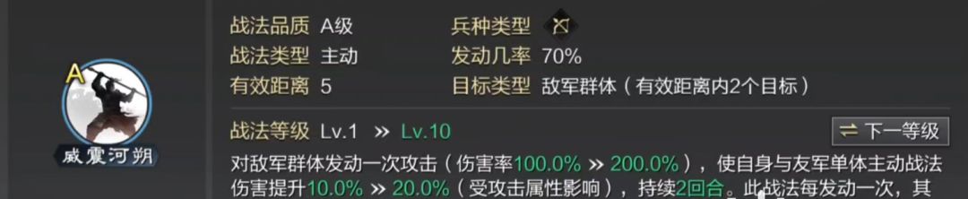 【主战法——威震河朔】群袁绍的主战法威镇河朔,非常强力的物理输出战法,剑诀个人给S级,非常契合法刀体系,能够在前4个回合都保持相当高的发动率,而且攻击距离覆盖全场,还能为队友提供不错的增益效果,是众多法刀里,输出最稳定的。