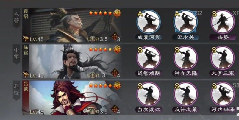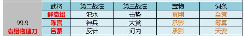建队体系袁绍是一个非常依赖体系的输出卡,所以他并不能成为马超那样的核心输出,需要队友提供更多帮助(但是同样也有袁绍法刀2人残队穿满兵的战报,开发空间较大)目前与袁绍最契合的体系,就是法刀的神赏体系+流氓的始计浑水体系法刀体系战法如下:汜水关+击势十分重要,神赏工具人个人更推荐李儒,能够吃够袁绍的战法加成,白板袁绍亦玩,强度会低一点。