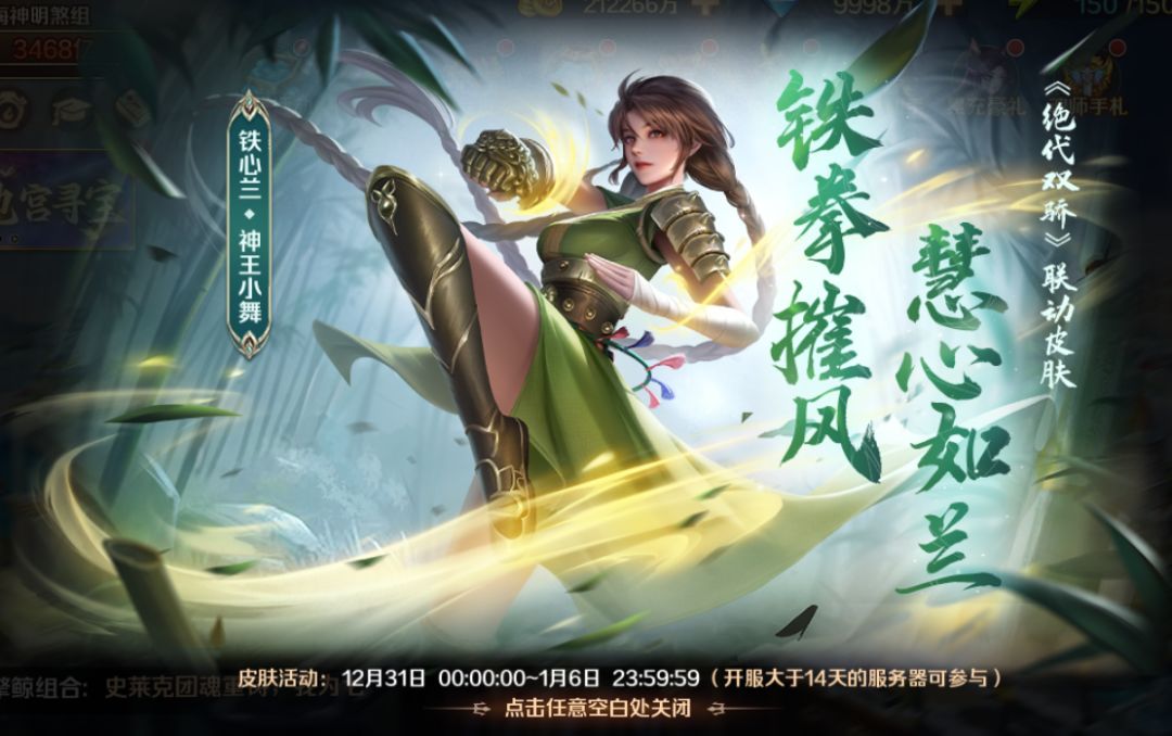 绝代双骄圣品皮肤首发铁拳摧风,慧心如兰,铁心兰·神王小舞限时登场!通过累充、钻石消耗等活动获取兑换道具,即可在“绝代兑换”活动中获取!还有绝代狩猎礼盒、绝代辞青礼盒等好礼等你来拿哦!