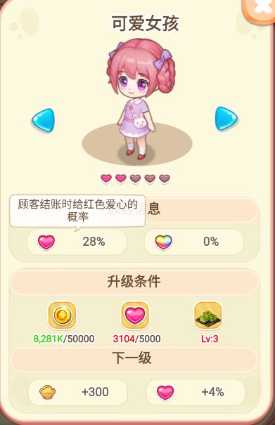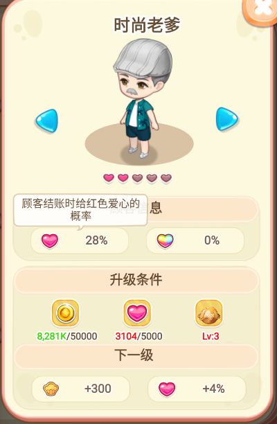 优先升级【时尚老爹】与【可爱女孩】。能直接增加结账时给【爱心】的概率。
