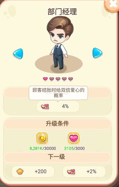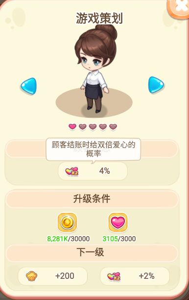 再升级【游戏策划】与【部门经理】。这2位【顾客】是增加给了爱心之后,翻倍的概率。