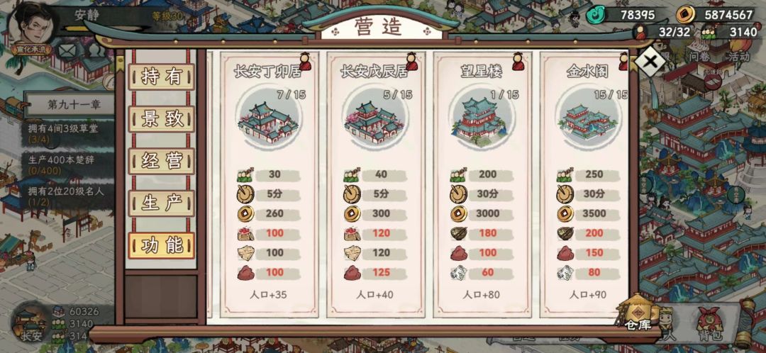 游戏中的建筑有很多,一共分成四类,居住类、景致类、生产类、经营类,每个建筑都能给玩家们带来不同的收益。
