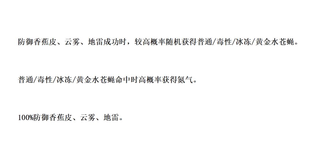 防御香蕉皮、云雾、地雷成功时,较高概率随机获得普通/毒性/冰冻/黄金水苍蝇。