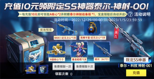 今天小白为大家来详细解析一下这次10元充值领取ss级武器泰尔-神射-001的活动(活动时间2022年12月29日到2023年1月5日)每充值10元就可以领取A级核心*2加泰尔神射战备箱*1,领取到之后宝箱会自动开启。泰尔神射战备箱内奖励包含(泰尔科技-神射-001、M4A1-纪元之心、高爆手雷-纪元之心、暴走哈莉、A级碎片、可合成碎片)