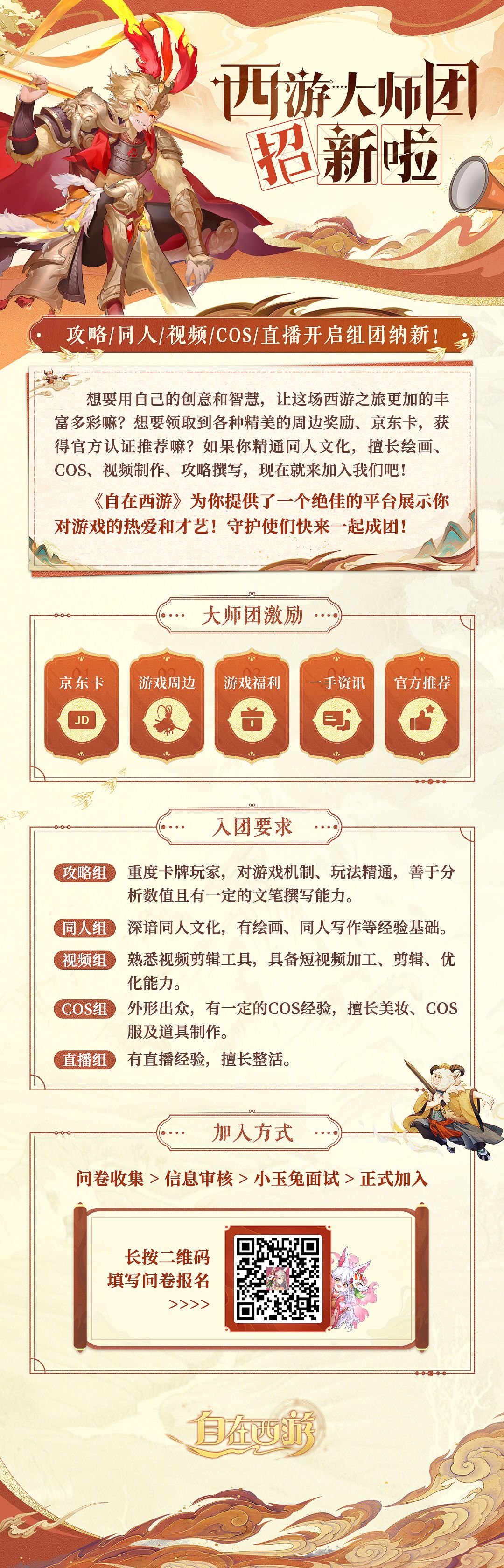 加入西游大师团,除了可以获取到丰厚的奖品激励、近距离与各种大大们共同交流之外,还有机会和《自在西游》的项目组接触,第一时间获取游戏的最新资讯、独家定制访谈栏目等!快来报名吧!