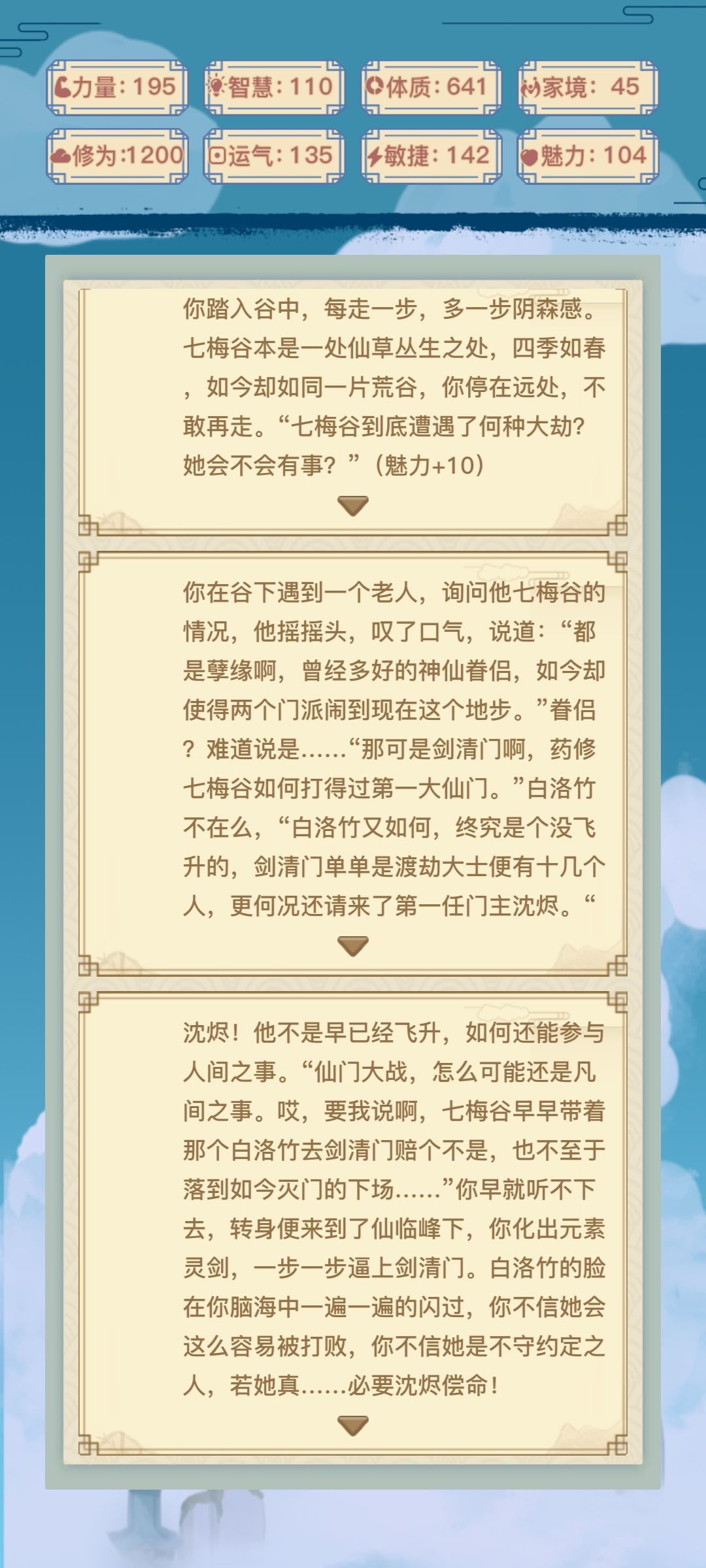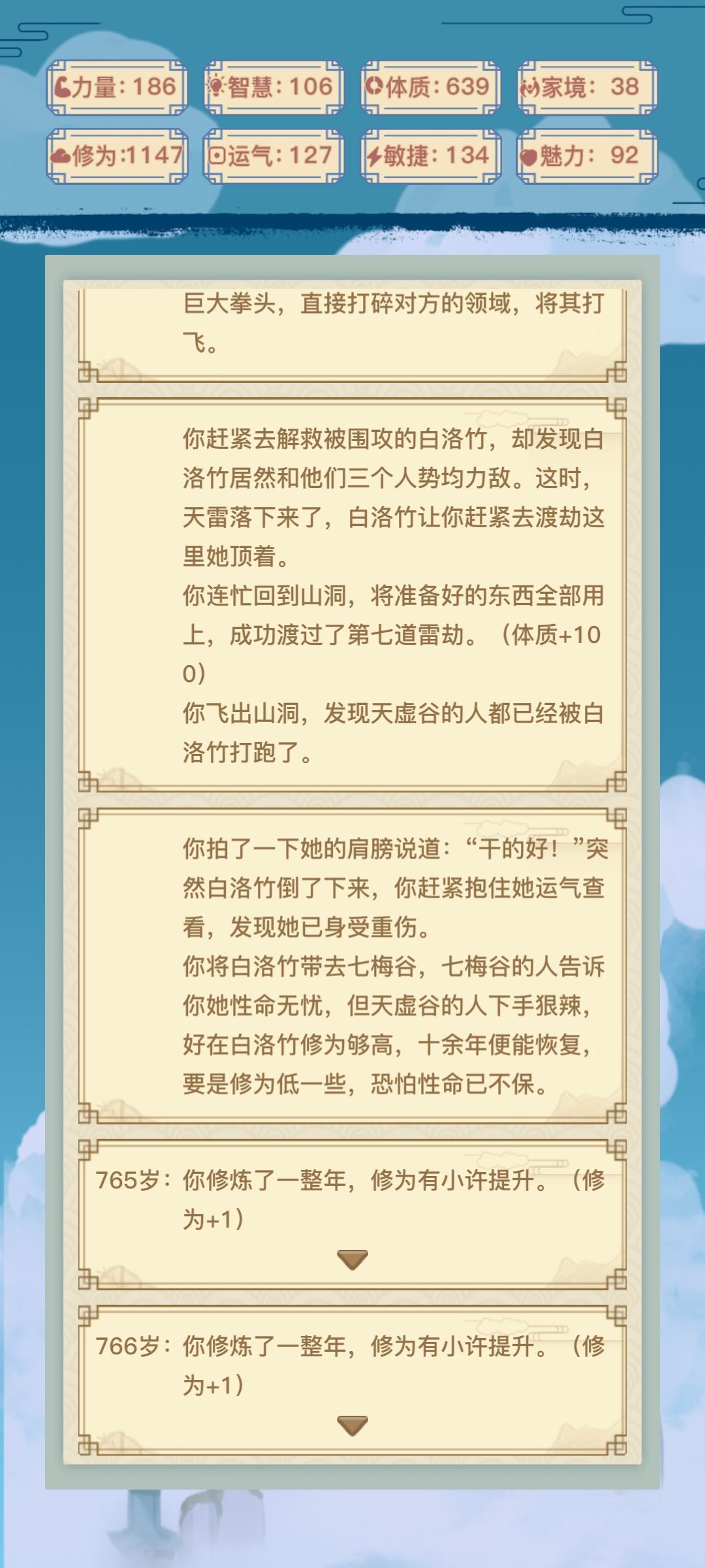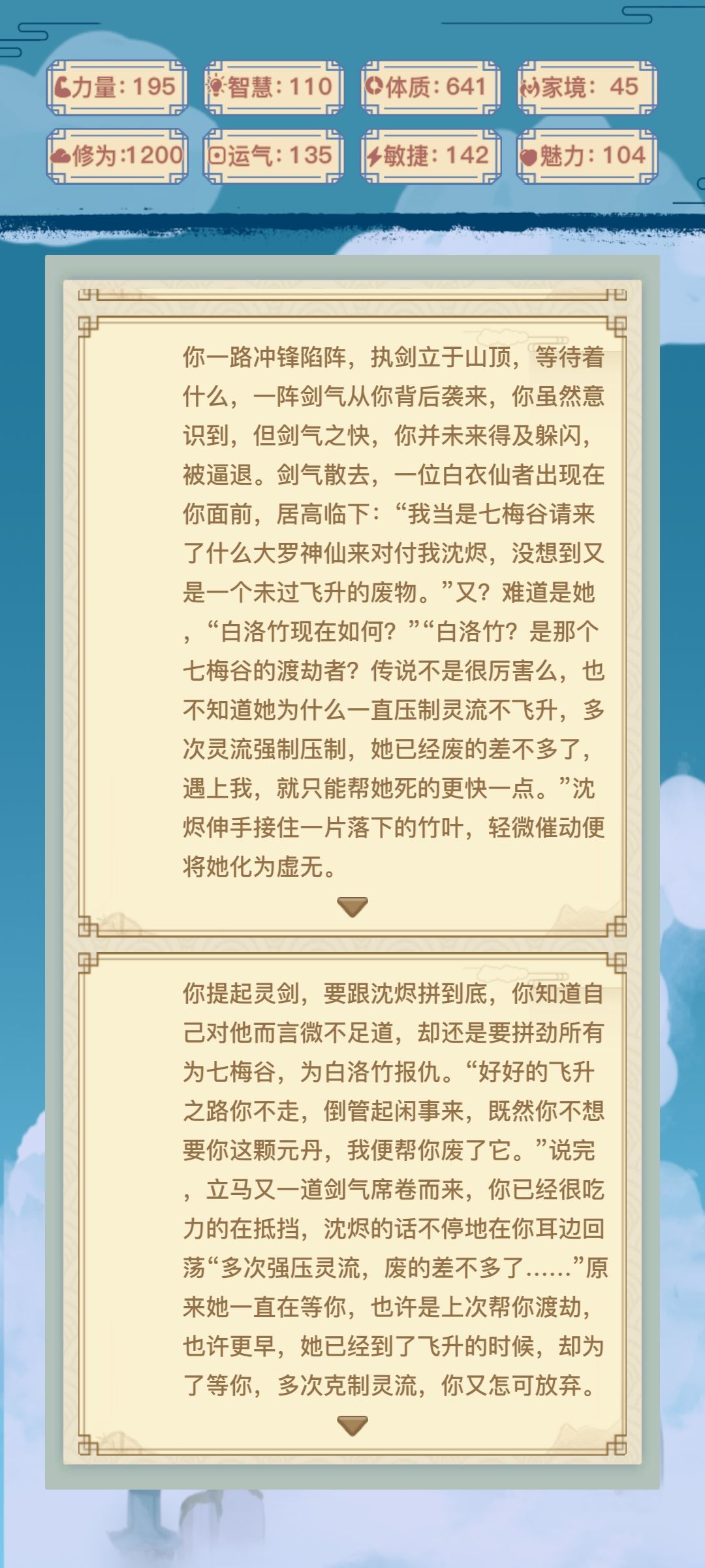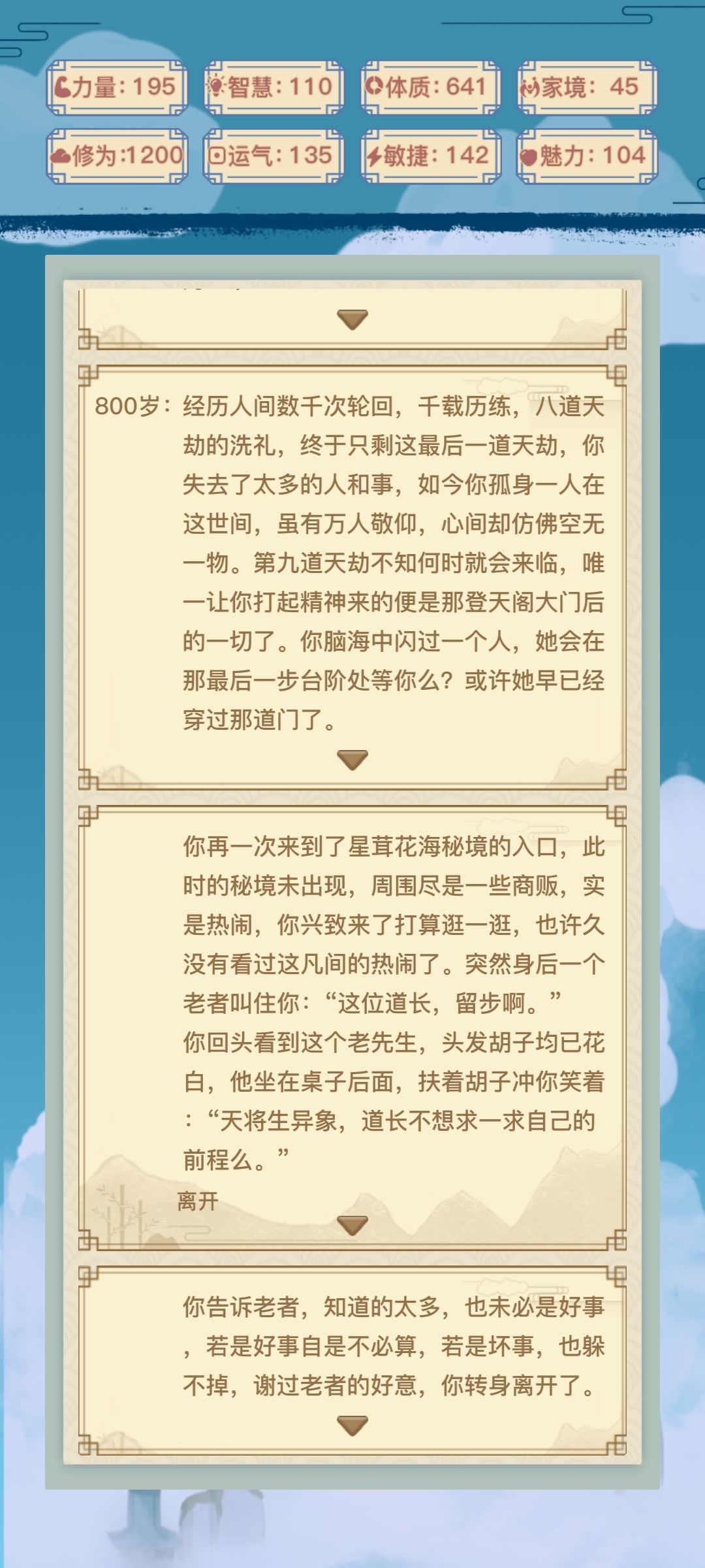 然后就是苟住,做每个选择都要谨慎而且三观正,比如一些明显是逆属性克制的战斗和不留心眼好奇害死猫的选项前期选了就是寄。等到410修为那些选项才能选,具体的可以看其他大佬写的事件选项要求。