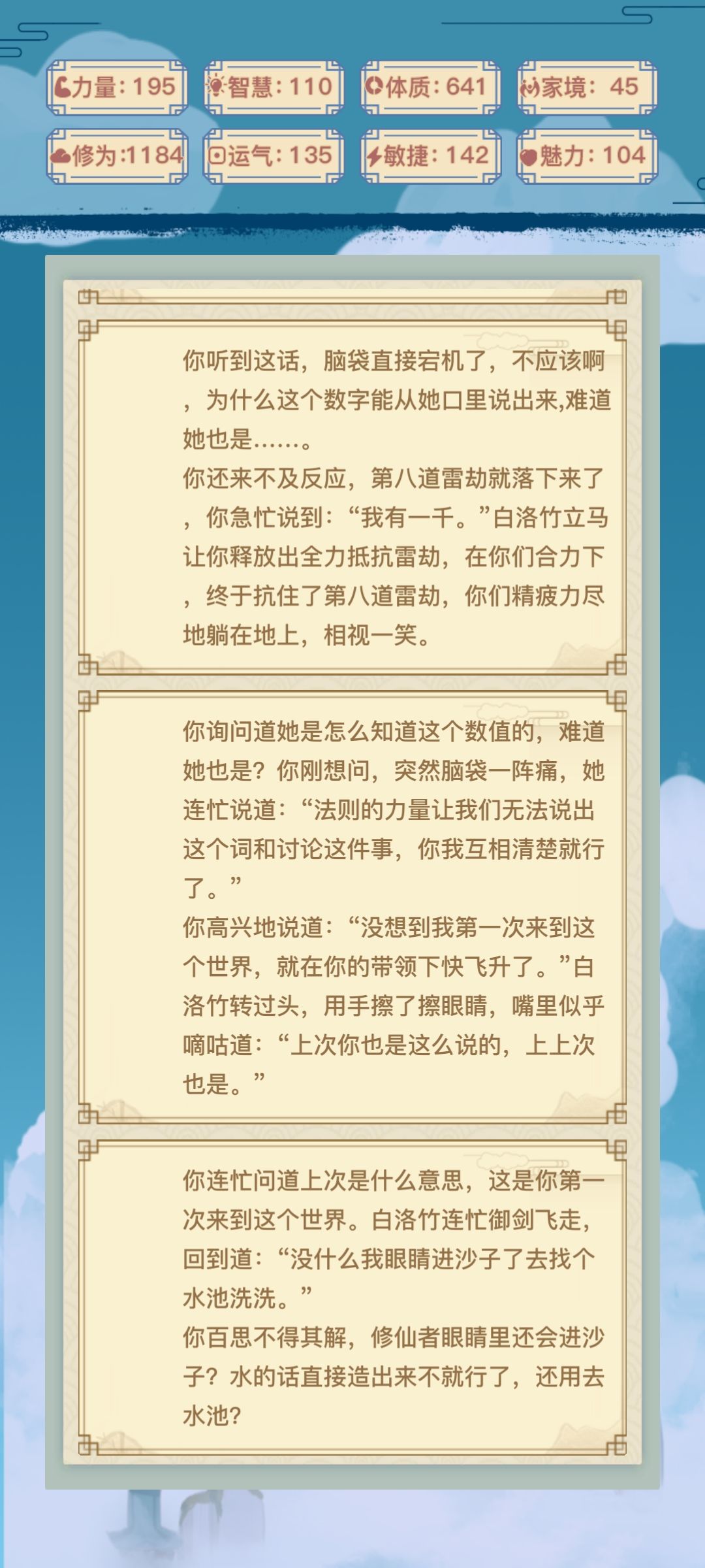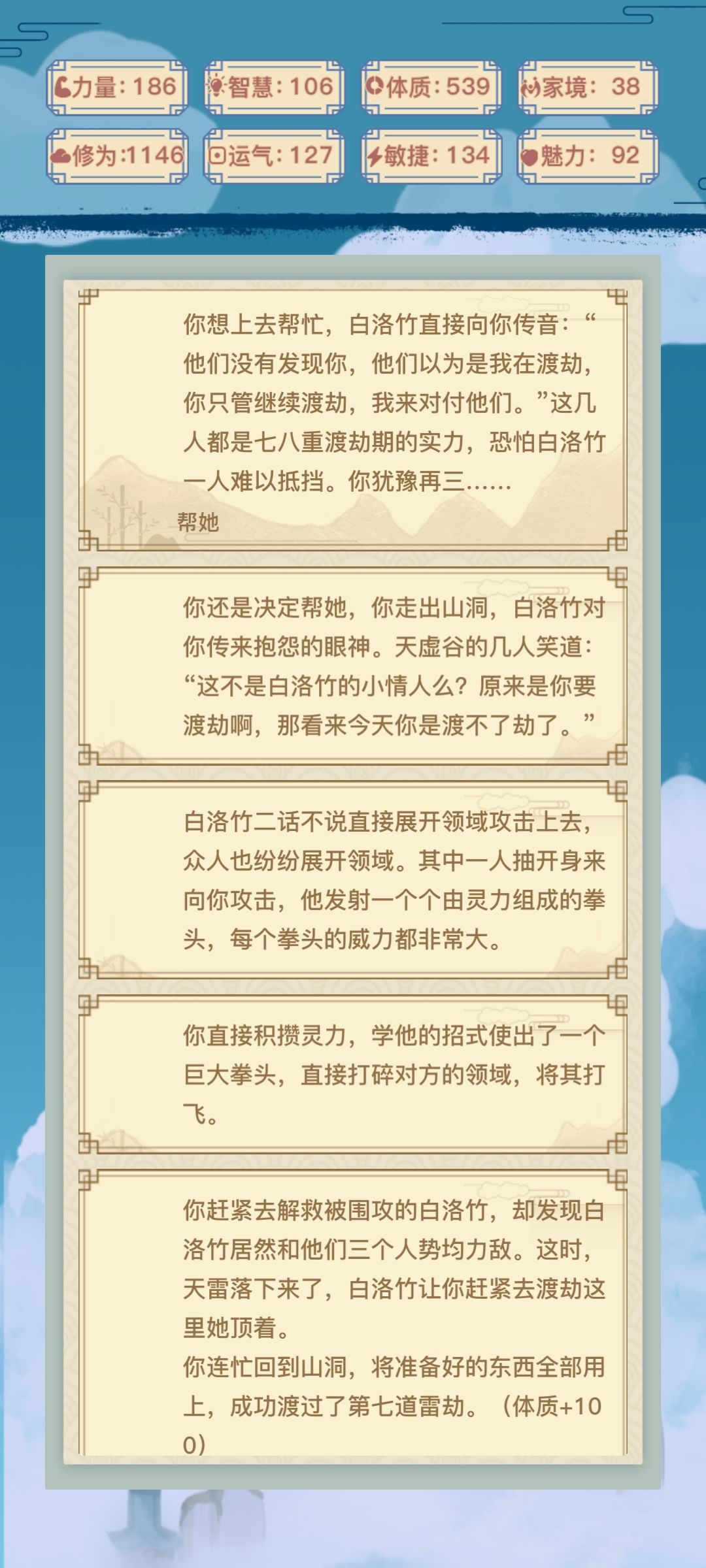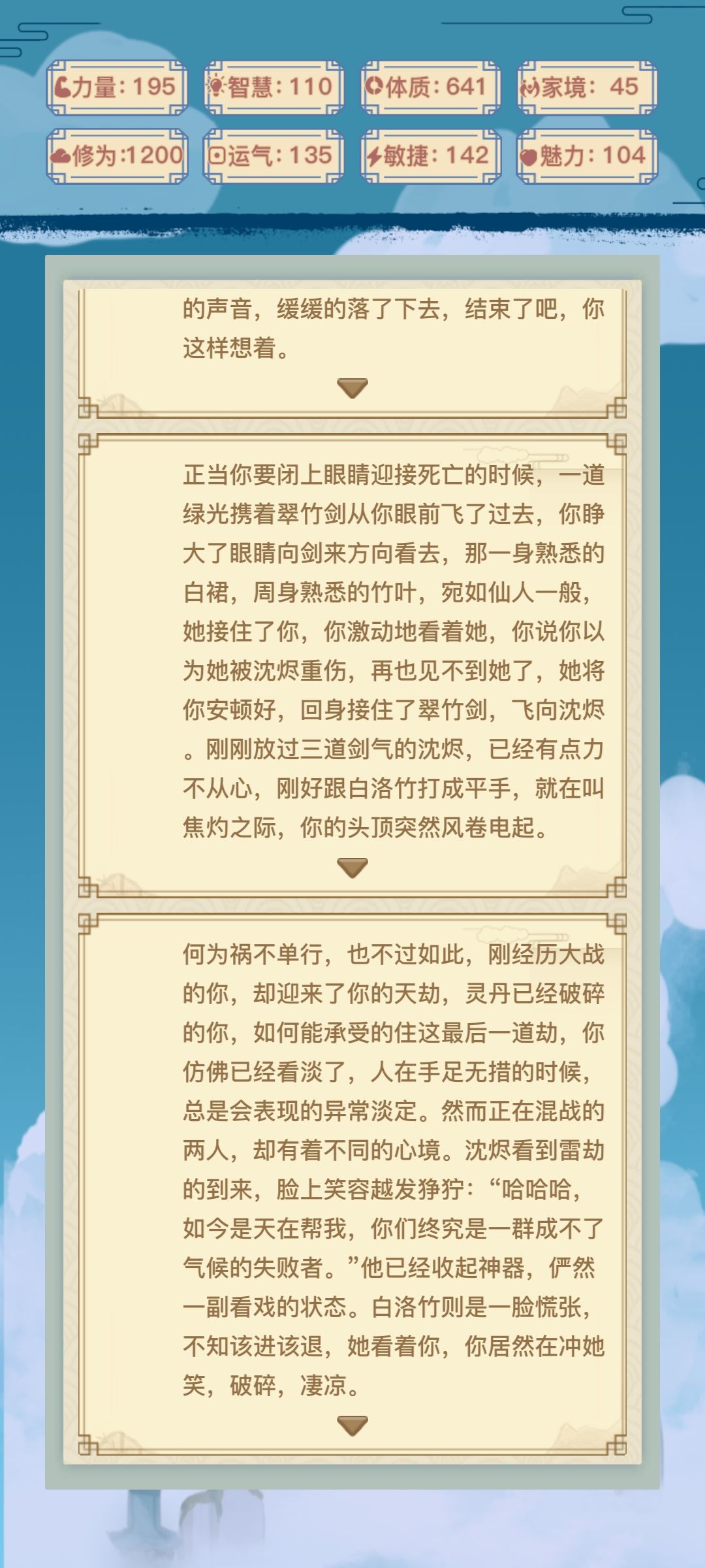 第七道天劫四人围攻白洛竹,白洛竹可以一打三,如果力量大于150可以成功帮助白洛竹消灭其中一人这样顺利渡劫,否则白洛竹就会出事,第八道天劫修为限制从1000提升到1400。