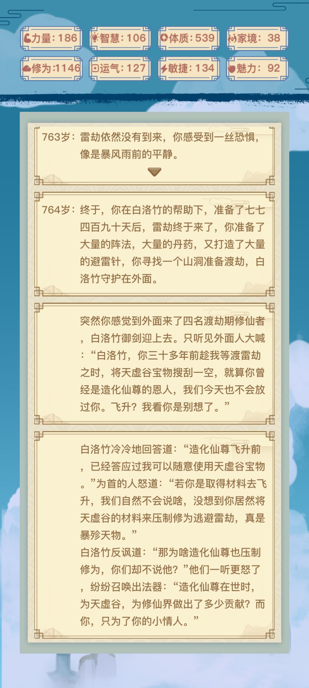 最后活到800岁第九道天劫,开局不理算命老头,然后走到七梅谷门口进入看看,如果不进入就没有天劫失败。发现七梅谷被毁为白洛竹报仇,接下来重伤濒死的时候一直挣扎不放弃超脱成功最后一同通天完美结局。