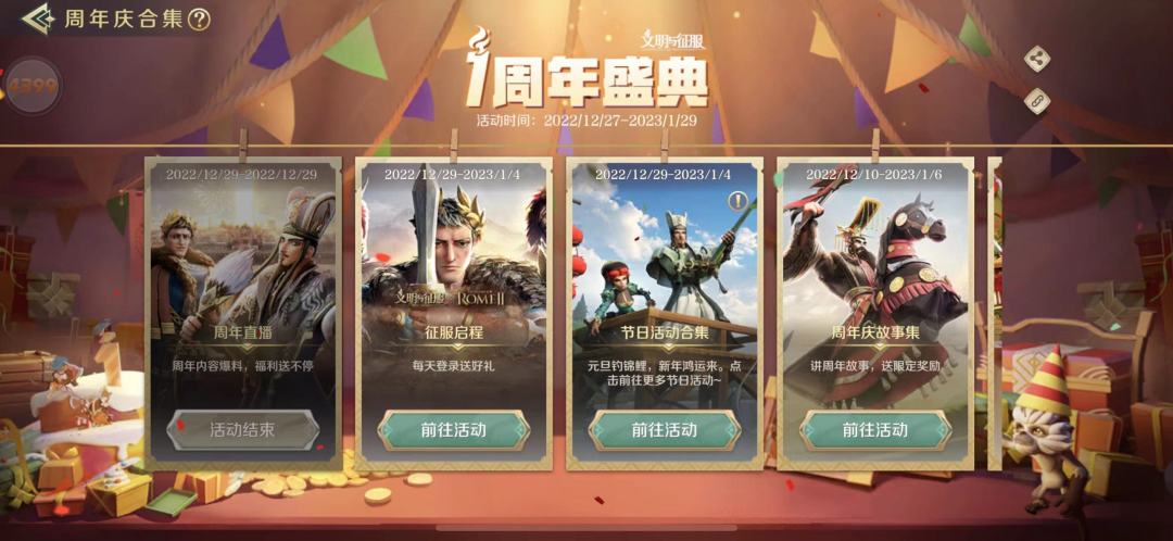8.2022/12/30 - 2023/1/6 打开年度记忆文明与征服 会帮助玩家汇总这一年,一起走过的路。9.2023/1/1、2023/1/8、2023/1/15、2023/1/21高卢叛军2023/1/1、2023/1/8、2023/1/15、2023/1/21 总共开启四天,每次持续一天,领主大人们只需清剿叛军,就能收获大量奖励。