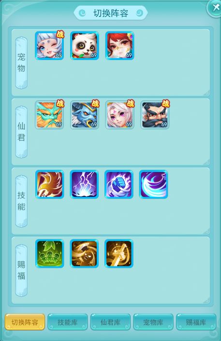 初始少侠们可以选择 4个人物技能、3名宠物、4名仙君和3个赐福;不过每轮战斗结束后,又会再随机出现一次技能/仙君/宠物/赐福的选择;随着阵容的扩充,少侠们也能切换到不同阵容进行战斗啦~