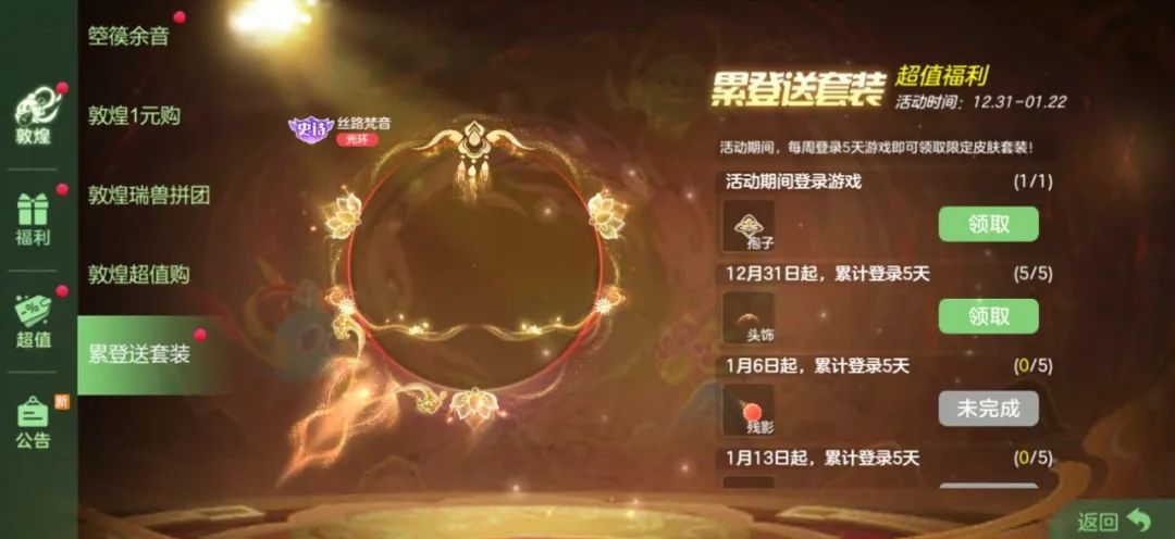 联动皮肤套装免费领啦!这是塔坦给球宝们的特别福利哦~只要完成简单的登录任务,联动限定孢子、头饰、残影、光环等你来拿!一起换上全新套装,感受敦煌千年文化之美。
