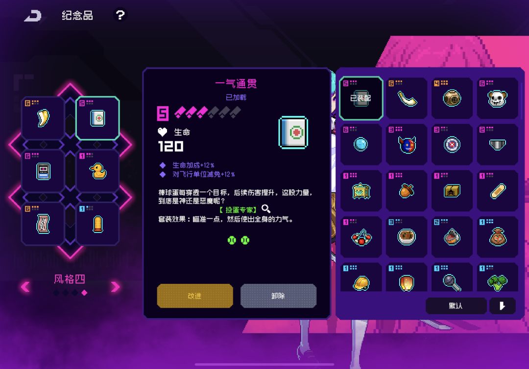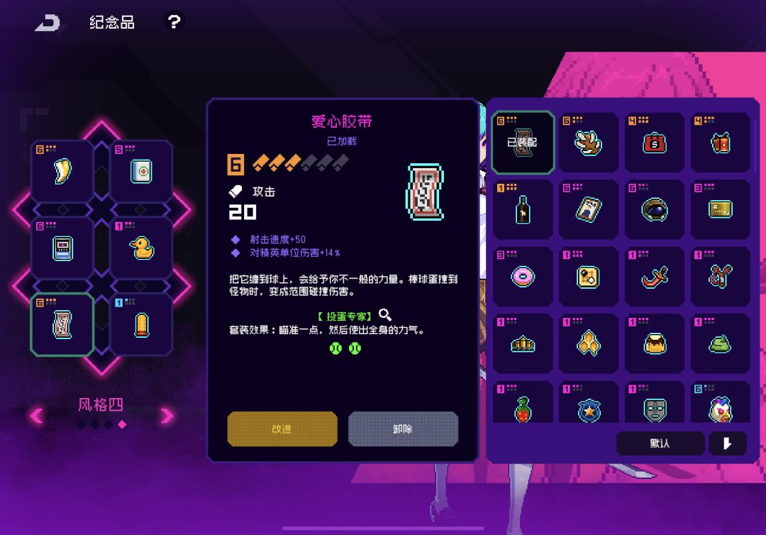 道具效果是携带三个金色愤怒精灵,这个大家比较熟悉我就不放图了。如果你能在其他位置凑够三个组件,那金牙是必不可少的关键道具,它的优先度甚至高于棒球流本身的套装组件。第一点,一号位本套装无橙色,优秀的双攻击面板奠定核心基础。第二,综上可知棒球流其实并不适合近身肉搏,金牙在补伤害的同时还能弥补前期疲软无输出的劣势,同时大程度避免近身肉搏帮助维持玩家状态。第三,局内很多提高伤害的道具无效,带愤怒精灵套可以提高局内捡到愤怒精灵相关道具的概率,此流派最优输出为满投蛋组件+满愤怒精灵组件可伤害最大化。