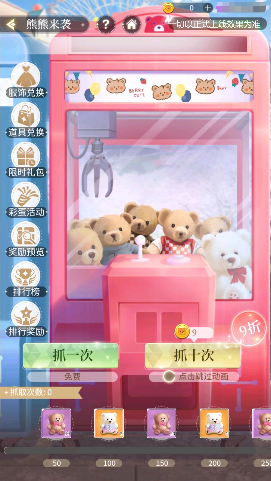 活动期间可通过限时礼包、彩蛋活动等方式获得小熊币。消耗小熊币抓娃娃,每次抓娃娃必定获得道具奖励,还有机会获得兑换道具白色熊熊或棕色小熊。