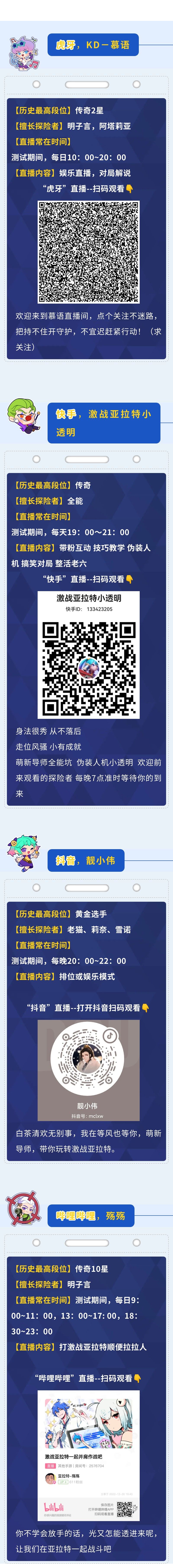 接入者们好呀,要说怎么样才能嘎嘎上分,那当然是跟着大神主播们学习他们的“上分精髓”啦!经过小舒的“认真取经”,小舒挖掘出几名优秀的“大神主播”。他们将会在测试期间各大平台开启直播想要跟着大神们学习的朋友们不要错过啦!