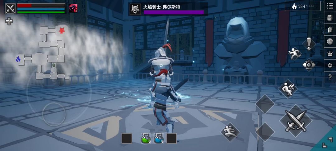 刷出炎骑套、弓在BOSS挥砍砍出第三刀的时候往前翻滚(距离要把握好伤害贼高)打出炎骑套的灼烧效果攻击高的话差不多能烧残。然后BOSS会在那里罚站然后找角度用弓补伤害就行了。