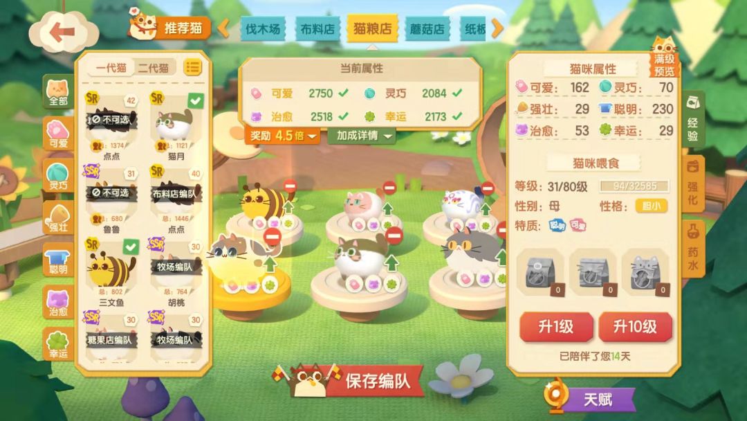 举例我的大号,鲁鲁+二代胆小猫战神+借小号胆小猫战神,三只猫全队光环叠加,五只40级强化30级带了一只17级r猫,猫粮店已经五倍可以拉高级猫粮了。