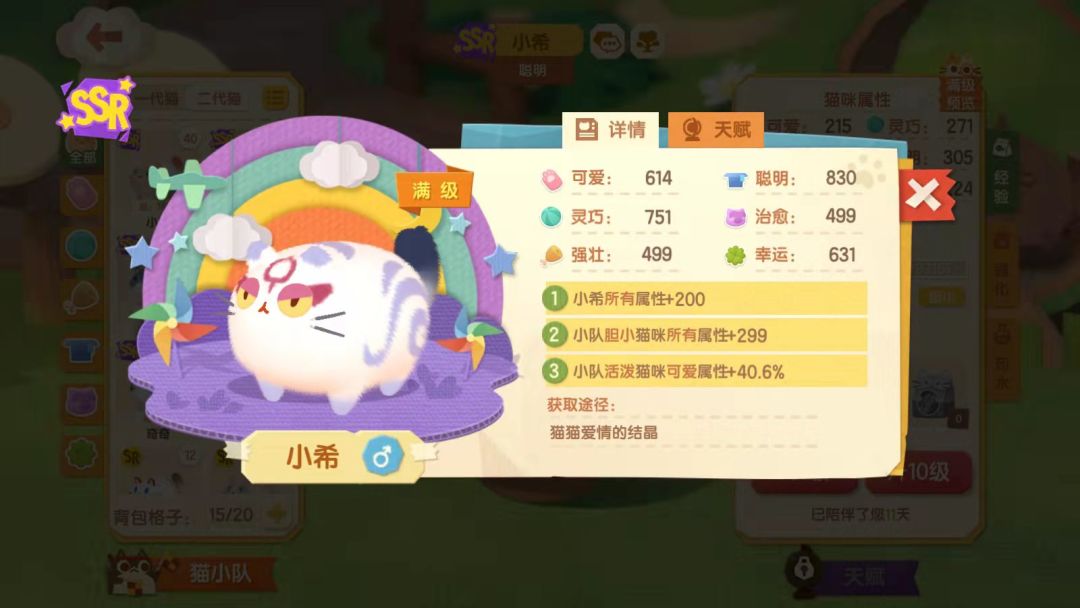 养猫要投入的资源需要很多,拉扯大一只猫真的很不容易。宝藏关卡会对性格有要求,所以每种性格的猫至少要养一只战神猫。什么样的猫是战神猫呢?就是二代猫中第二条强化词条为“小队所有猫所有属性+200”或者“小队中所有xx性格猫属性+299”的猫。