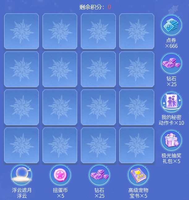 活动期间,完成每日任务领取积分,消耗积分点亮格子,点亮一排或一列可获得点券*666、钻石*25(共计50钻)、我的秘密动作卡*10、极光抽奖礼包*5、浮云遮月浮云、扭蛋币*5、高级宠物宝书*5等对应奖品,点亮全部格子还可得高档组合装-迷梦夜宴!