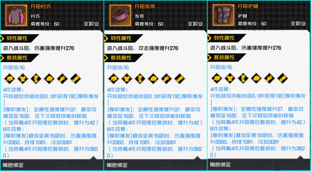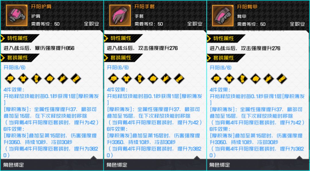 开阳套装能增强全属性强度和伤害强度,并且能弥补奔流掌持续施法时的缺点。