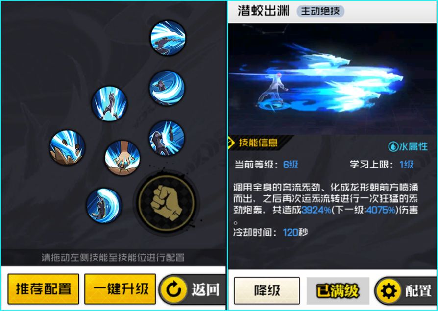 3.爆发手法:怒涛破(触发开阳套装BUFF)→锐眼药剂→潜能激发→潜蛟出渊→援助技。