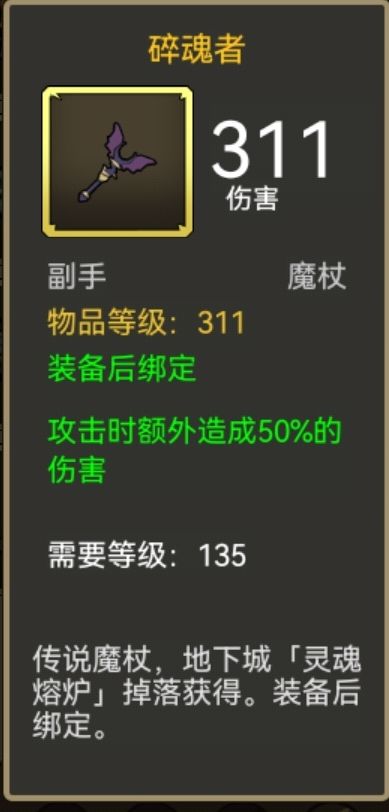 副手武器135级碎魂者(灵魂熔炉掉落),效果是攻击额外造成50%伤害,法系唯一指定毕业副手武器,谁用谁知道。伤害拉满。