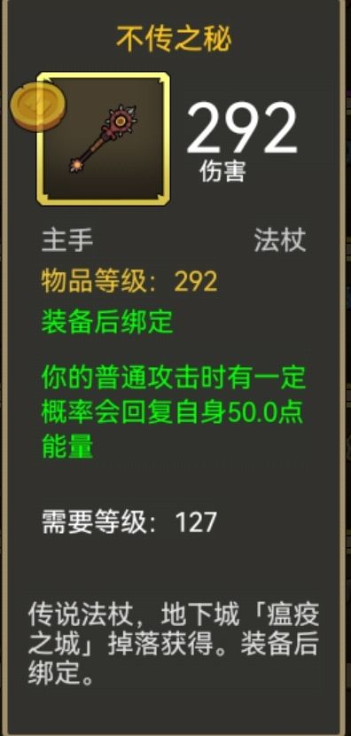 主手武器127级不传之秘(瘟疫之地掉落),效果是击中概率回复50蓝量。在主手武器中回蓝的首选,冰法的回蓝利器武器。