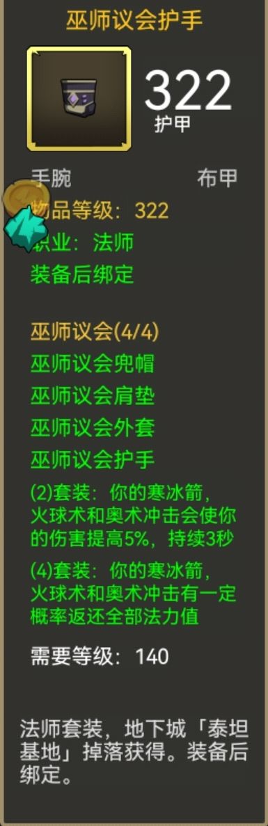可以看到我大号的精通是1700+,而效果就是公共冷却时间降低了58%。这么说数据大家可能没有概念。简单来说就是你的寒冰箭刚按完冷却就转好了。只要你有无限的蓝,就能释放无限的寒冰箭,一个接一个,相当于没有冷却。这就是冰法的魅力所在了。那么给大家推荐的毕业装备就是:140级巫师会议套装(泰坦基地掉落),2件套效果寒冰箭会增加我们的5%伤害持续3秒,请注意这个属性可以叠加,简直契合冰法,因为我们的寒冰箭基本上等于没有冷却,只取决于我们按的手速有多快,只要在3秒里按出多个寒冰箭,我们的伤害瞬间会叠到一个相当高的地步。4件套效果寒冰箭有一定概率返还全部法力值。又是非常契合冰法的属性。在我们的输出取决于我们的手速后,唯一限制我们的就是蓝量了,经常出现的情况就是1秒我们就没蓝了,而这个4件套属性能很好的帮助我们省蓝。