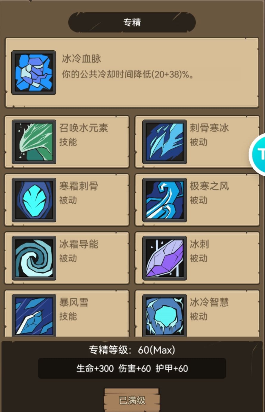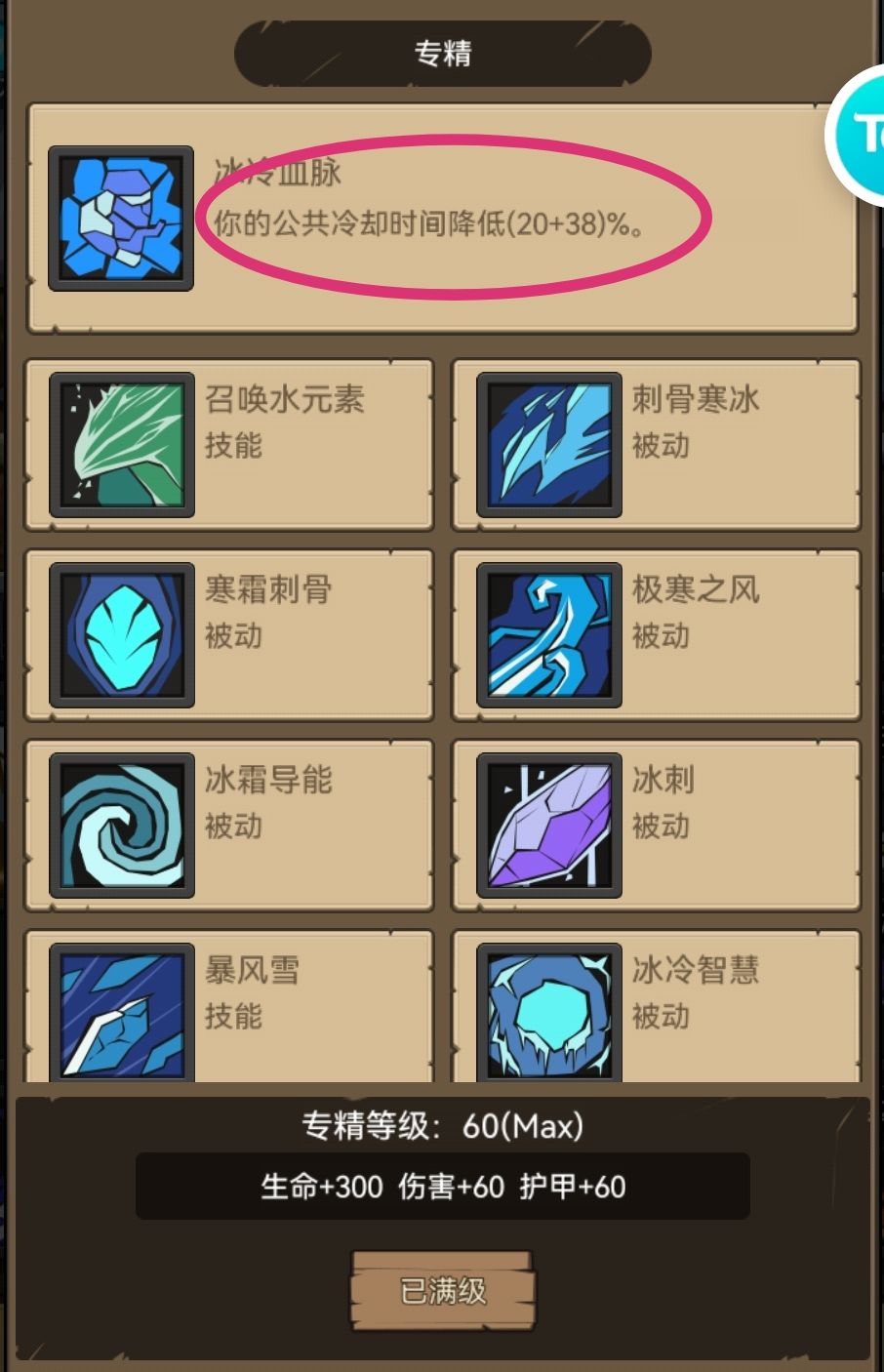 2.战斗界面我们的技能左边,专精可以解锁了。点开有三个分支,分别是火焰,冰霜,奥术三种。每个专精可以随时切换,但是分别需要单独升级,满级是60级。本攻略着重讲的就是冰霜专精。(其实通过60练级的过程,就可以大概了解到法师是一个身板比较脆,使用各种法术击杀目标的角色。而我们的冰霜专精则是着重以寒冰剑为核心的一个分支)。