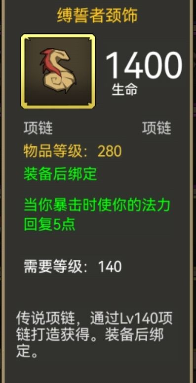 项链则有两种方案①金币多的去拍卖行搜索140级传说项链缚誓者颈坠。效果是暴击时回复5点法力,完美契合冰法,配合碎魂者,基本可以做到永不缺蓝。
