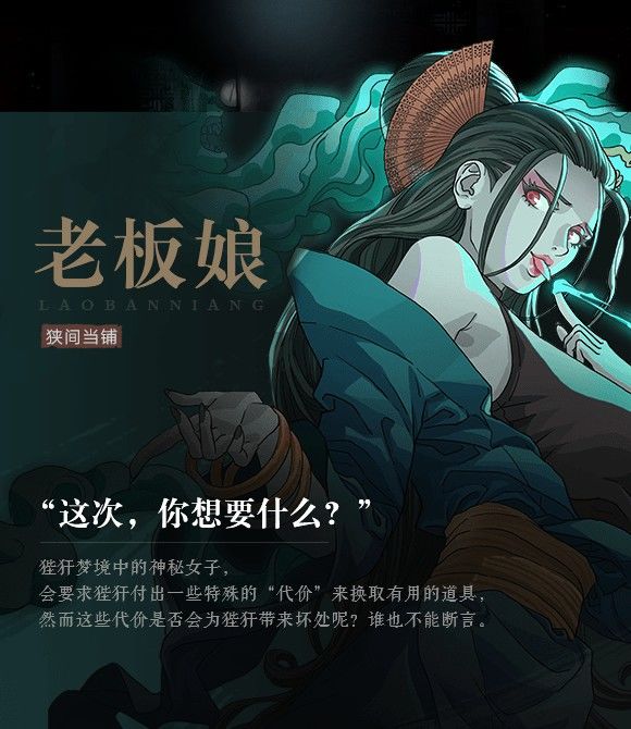 有理由根据游戏语音猜测老板娘就是何罗神的一个分身,“这一趟真是辛苦你了,英雄”“再给我更多更多的灵魂”“可别让我感到无聊啊”,推断是变换成老板娘的身份,利用我们的主角狴犴一边收集灵魂增强实力,一边为脱离封印为主角提供一些帮助,当然还有给自己漫长的生命中找点乐子。