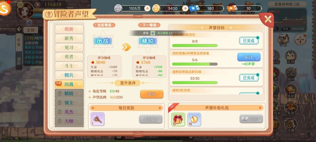 斗士:首先勇者到斗士生命评分加成就会从960提升到1200,这个等级的声望目标有1.阵眼达到2级,这个是相对比较简单的,就不说了。2.宠物亲密度达到100,一般像这个等级宠物亲密度肯定是是有100的,如果没有就用绑点去商城购买宠物亲密药。3.同时装备4件稀有品质装备,建议打到的稀有装每个位置留一件,就算放背包也不要分解,后期还有声望任务会用到。(这也是小布的血泪经验,把没用的装备全给分解了,等到做任务又嘿咻嘿咻跑去刷装备,还没刷全)。4.武器强化一次,之前囤的强化石起到了作用,但是强化一次既可以了,留点强化石后期还有强化任务。不要像小布一样心急全部强化了,后期做强化任务就傻了。5.使用山源物语所属图鉴3次,这个也比较简单,刷怪会几率掉落图鉴,去刷对应图鉴就可以了。