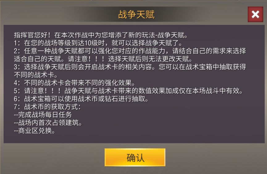本次为战争天赋首次亮相,我们为各位统帅准备了五种天赋可选,每一种天赋选择后都会直接赋予统帅一定增益和减益,可战场等级10级后,在选择面板中点击右上角叹号查看每种天赋的基础属性。