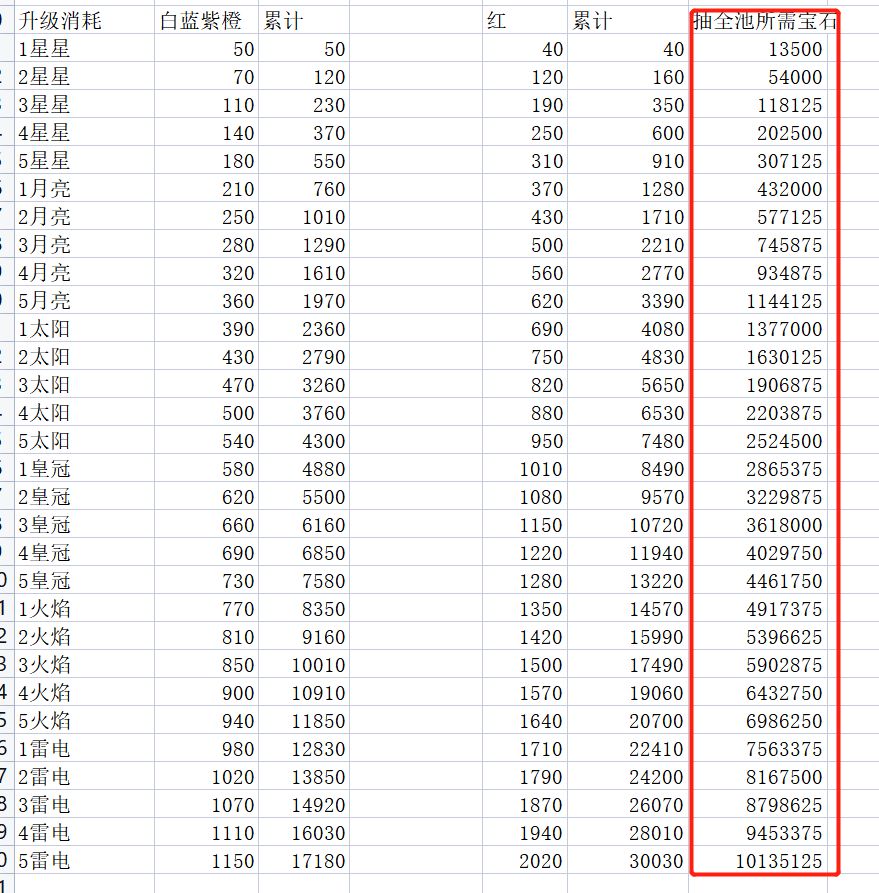 红色框起来这一行,表示你通过抽全池培养出6个红将都达到雷电5的宝石期望。感觉出乎意料的低啊,武将升级的消耗是马策给的,应该不会有错,若算法有误,恳请指出。这是根据红卡价值=56来计算的,之后出抽卡活动,红卡的价值必然会跌,培养武将的成本也必然会降低。