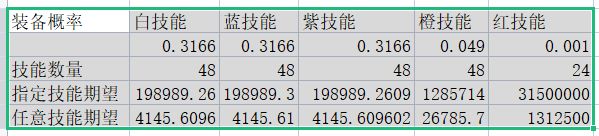 第二行表示对应颜色技能的总量是多少。比如白色,白卡每系有2个,一共6系,那就是6*2*4=48个技能。然后就能得出,抽钻石宝箱得到任意红色技能所消耗的宝石的数学期望=橙装价值/红技能概率*红技能数量=131W宝石。