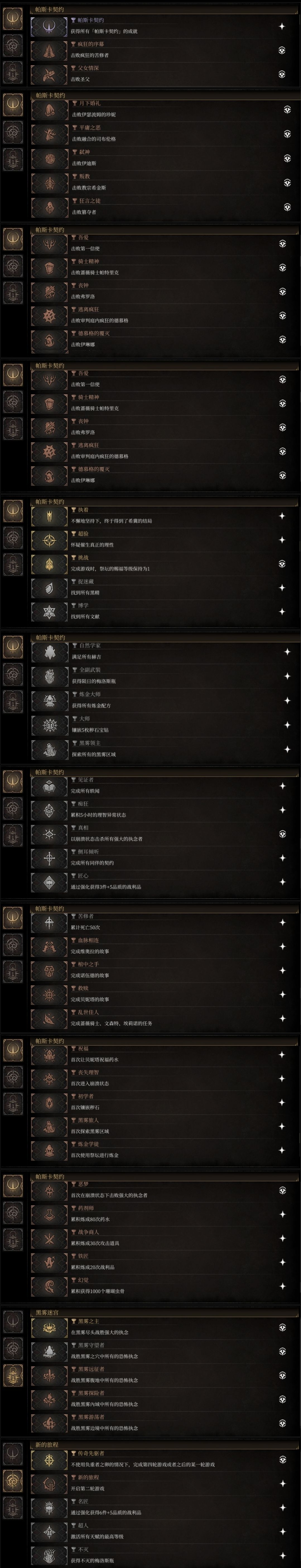 18银 炼金大师-成就需要收集齐19个配方,收集过的配方可以在祭坛消耗品进行炼金制作,游戏中大部分配方可以直接购买获得(特别是战斗道具配方关系到另一个成就),其中所有药水配方也可以在马车里通过贝妮塔进行药水强化祝福低概率获得(建议贝妮塔祝福升满不然祝福药水成功率25%,更别说配方了),其中岩化粉尘和破晓之辉配方只能通过祝福获得(祝福获得岩化药丸和破晓圣辉,超级强化buff),给贝妮塔三个陶土契约道具可以获得三个配方:敛骨粘液配方、昂扬浓汁配方、复苏浓汁配方,流程支线可以获得两个配方:(1)阿达米亚完成熬药NPC支线(5个阿达米亚草,5个活性污染体)后杀掉圣父再去会发现熬药NPC发疯杀掉获得祛理药水配方(2)伊迪斯找蜡烛的贵族第二任务,贵族文森特找女儿找的就是赐福之地的自杀修女埃利诺,拿到染血的遗书后回去找贵族获得暗化药水,理论不漏在地下溶洞第一个商人那里解锁成就