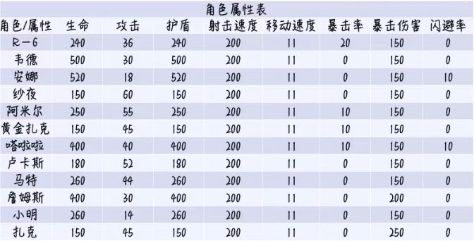 根据游戏里提供的指标一共分为生命、攻击、护盾、射击速度、移动速度、暴击率、暴击伤害和闪避率八种属性,其中主要差异点在于生命、攻击、护盾及暴击相关数据等。