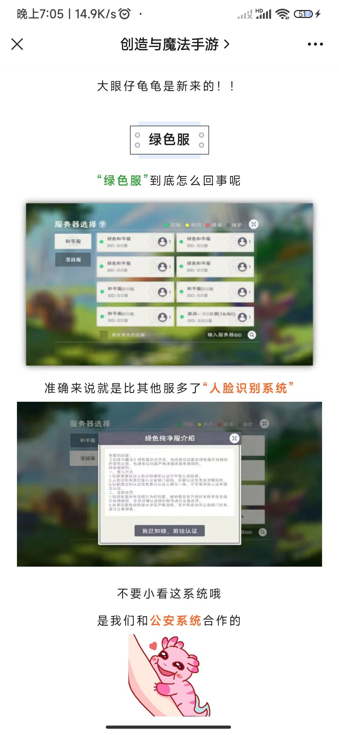 我内测入坑,如今已经弃坑1年多了,本对这游戏已经不抱希望,直到今天看见了小创君发的这条消息,我很激动又开心,绿色服绿色服,这不就是我一直想要的服务器吗。