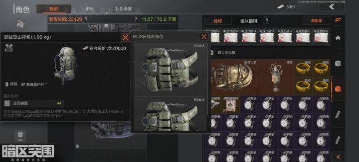 极限跑商之究极套包术一个野战登山包里套两个rush包rush包里刚好放下两个b6战术包放下44+8×4一共76个行动物资缺点是只能放下一格的东西